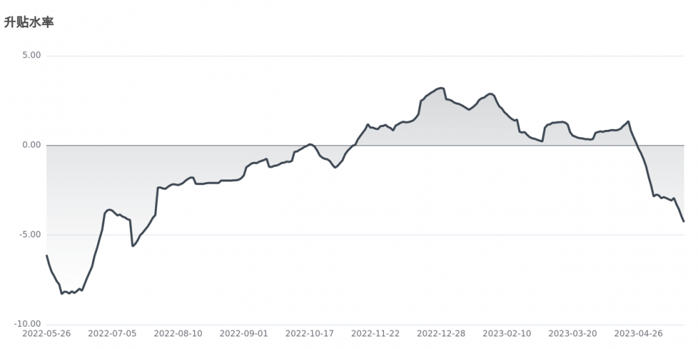 今日该指标值为-4.28%,目前该指标处于近一年较低区间,说明投资者对认为A股市场趋于触底反弹。反映期货市场投资者对市场的看法,该指标越高说明投资者认为当前市场较强,越低则说明认为市场相对较弱,因而与上证指数正相关。