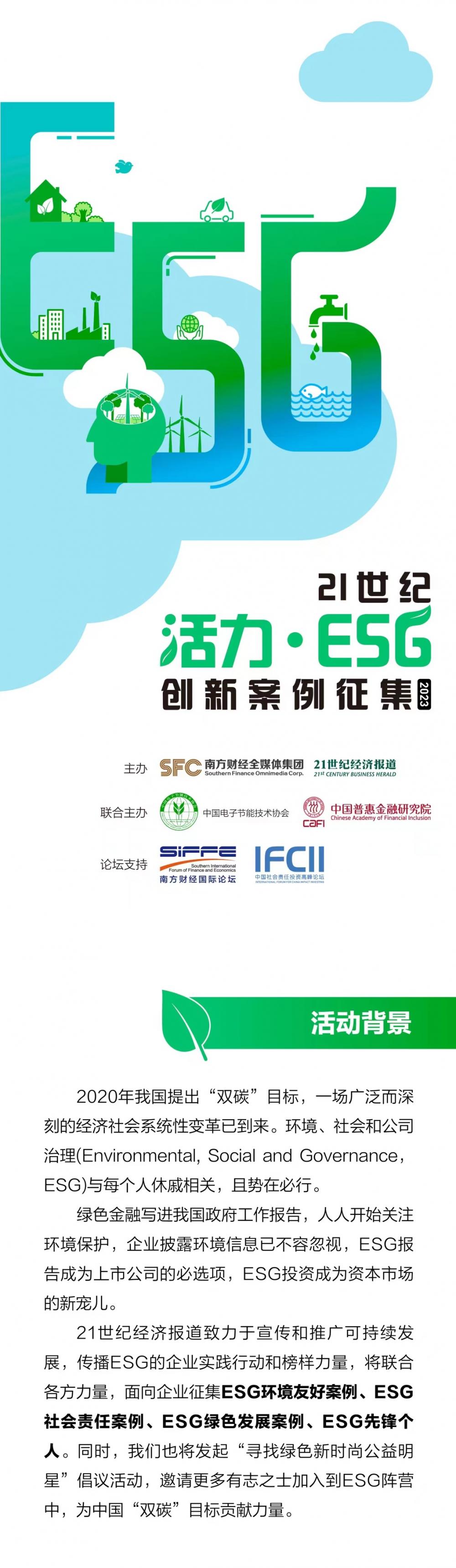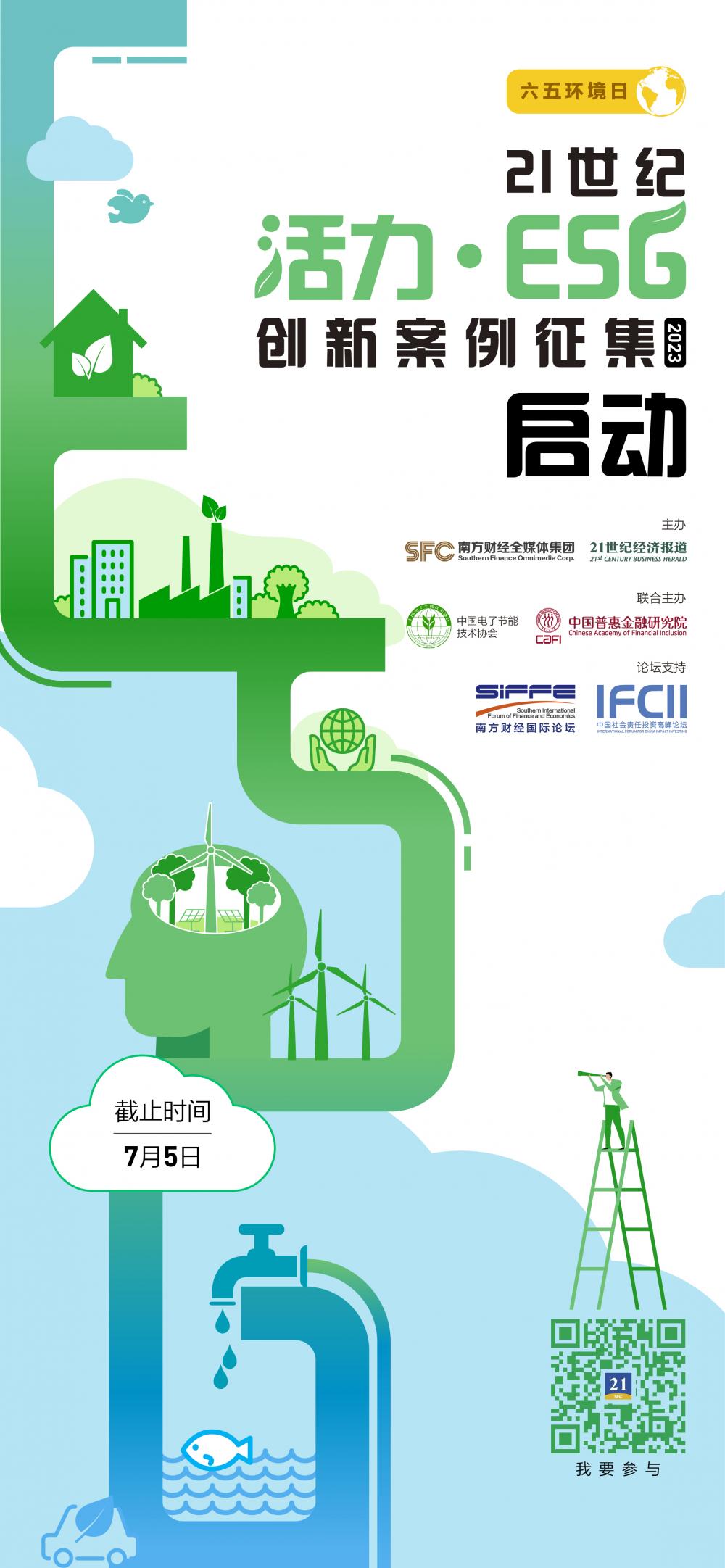 今年“六五环境日”即将到来,又正值企业纷纷发布年度ESG报告之季。为树立一批ESG典型示范案例,作为企业可持续战略实践的指引参考,即日起,南方财经全媒体集团21世纪经济研究院将联合中国电子节能技术协会、中国人民大学中国普惠金融研究院(CAFI)正式发起21世纪“活力·ESG”创新案例(2023)征集活动。