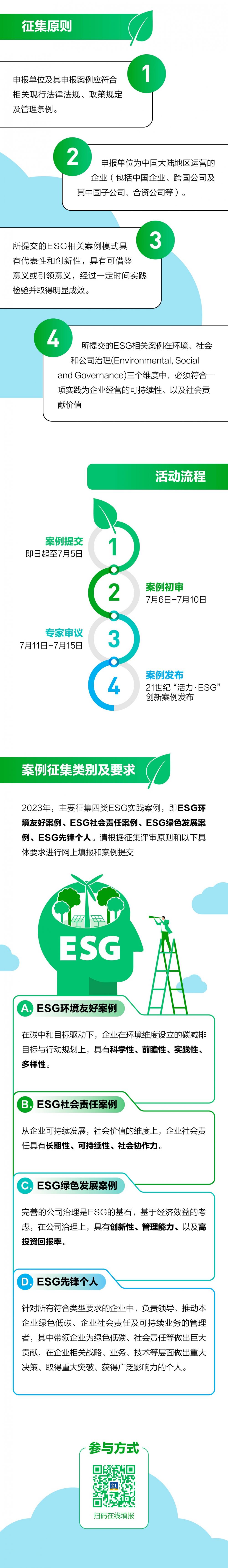 本次案例评选将采取专家评审与网络投票结果相结合的方式,本着公开、公平、公正的评审原则和流程,最终入围21世纪“活力·ESG”创新案例(2023)”名单的案例,将于21世纪“活力·ESG”论坛上公布,入选案例将编入《21世纪“活力·ESG”实践案例集锦(2023)》。