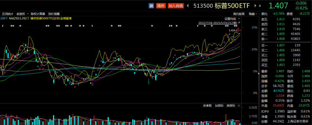 今日(5月31日),截至午盘,标普500ETF(513500)跌0.42%,溢折率达0.61%,溢价显著,近10日资金净流入超1.5亿元。