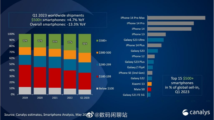 高端转型的必要性在于整体市场持续低迷的情况下,留给中低端机型走量的空间越来越小,但高端份额却在逆势增长。报告显示,在2023年第一季度全球智能手机出货量同比下降13.3%的背景下,全球高端智能手机逆势而上,同比增长4.7%。