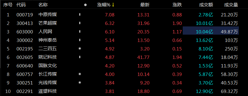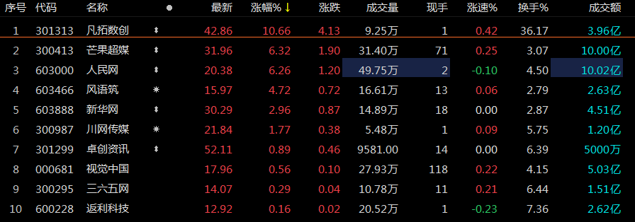 成分股方面,除了芒果超媒、人民网外,中原传媒涨超7%,神州泰岳涨超5%,二三四五、姚记科技、国脉文化等跟涨。