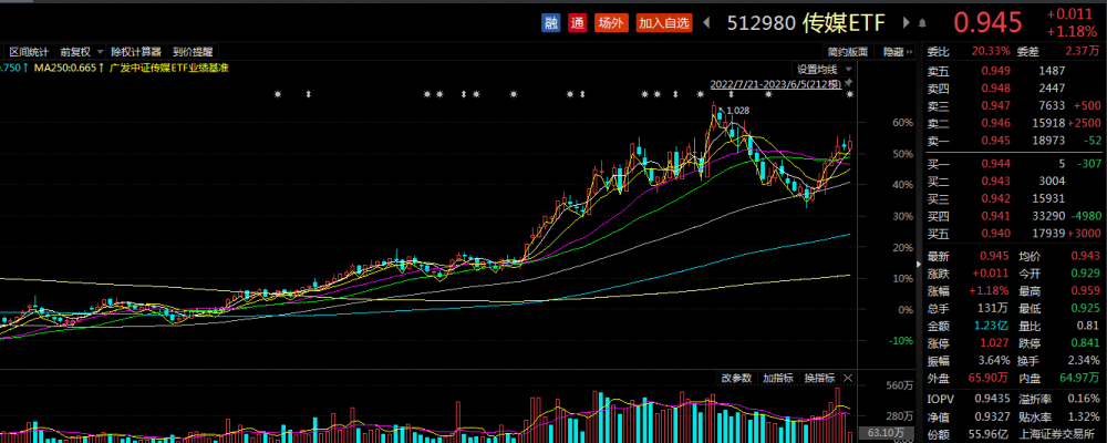 芒果超媒为传媒ETF(512980)第五大重仓股,该ETF今日震荡走强,盘中一度涨超2%,现涨1.18%,盘中溢价交易,溢折率0.16%,换手率2.34%,成交额1.23亿元。