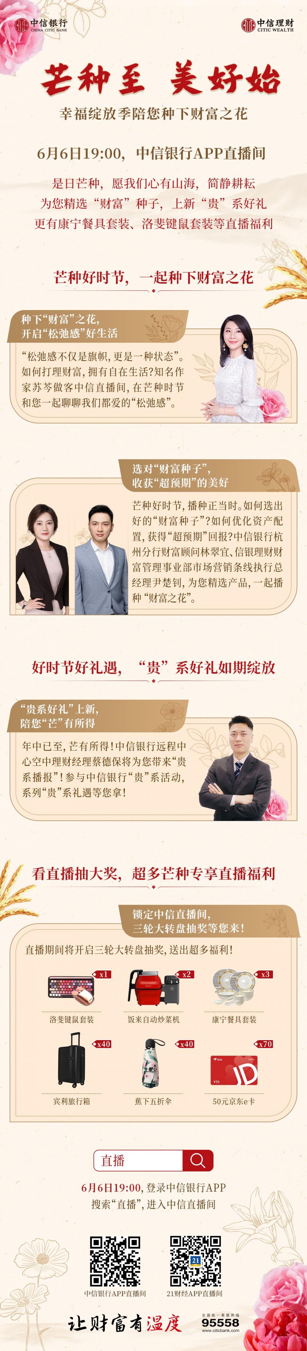 播种财富种子,收获美好回报。如果绽放的人生是每个人憧憬的“罗马”,那财富管理就是帮助我们通往“罗马”必由之路。市场如何展望?财富如何规划?产品如何配置?本期直播间就有最“接地气”的答案。即刻扫码,登录中信银行APP,搜索“中信直播”进入“幸福绽放季”芒种专场直播间,看直播,抽洛斐键鼠套装等好礼!