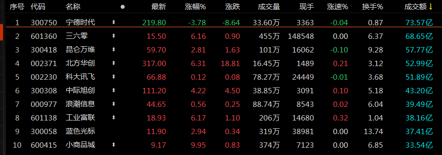 沪深两市今日成交额8738亿,较上个交易日缩量668亿。个股方面,宁德时代以73.57亿元成交额居首,三六零成交额为68.65亿元,昆仑万维、北方华创、科大讯飞成交额均在50亿元之上。