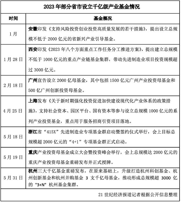杭州并不是个例。21世纪经济报道记者梳理发现,今年以来,安徽、浙江、上海、西安、广州等省市都推出了千亿量级的产业基金集群。这些规模庞大的产业基金群诞生背后,各地正通过非单一引导基金的形式,扩大引导基金规模,形成体系化建设。