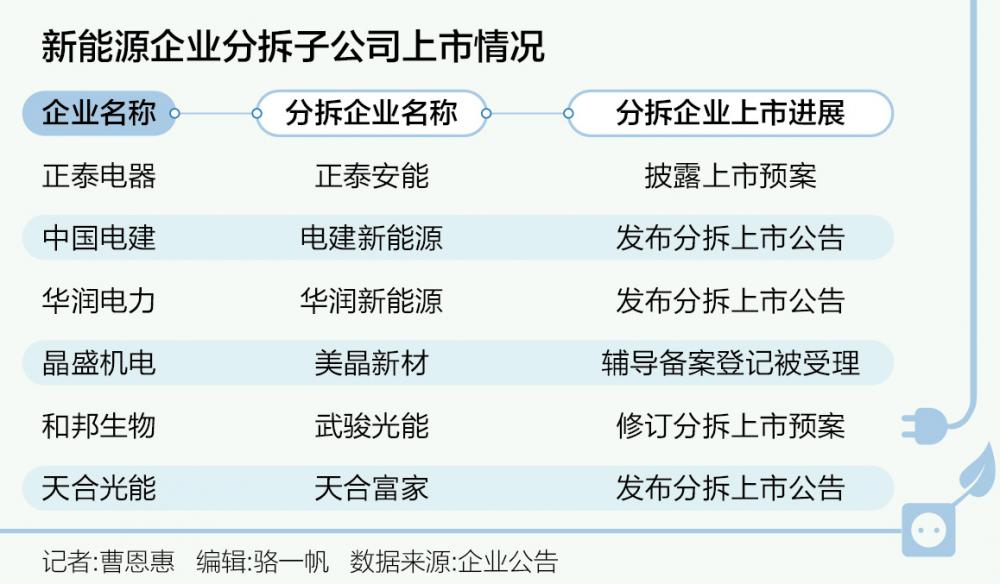 21世纪经济报道记者注意到,今年以来,新能源领域掀起了分拆上市的热潮,正泰电器、华润电力(00836.HK)、晶盛机电(300316.SZ)、和邦生物(603077.SH)、天合光能(688599.SH)、中国电建等公司纷纷宣布分拆旗下新能源资产。