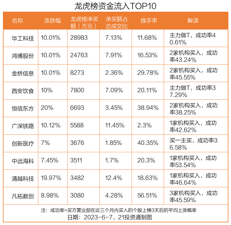 6月7日,上证指数上涨0.08%,深证成指下跌0.6%,创业板指下跌1.61%。盘后龙虎榜数据显示,共有49只个股因当日异动登上龙虎榜,资金净流入最多的是华工科技(000988.SZ),达2.9亿元。