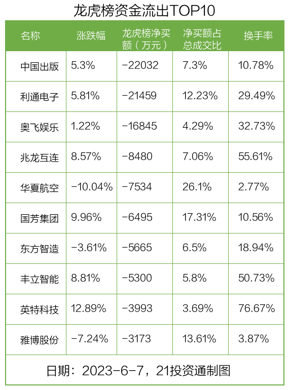 而龙虎榜中资金净流出最多的是中国出版(601949.SH),被净卖出为2.2亿元,占总成交金额的7.3%。中国出版收盘上涨5.3%,换手率为10.78%。