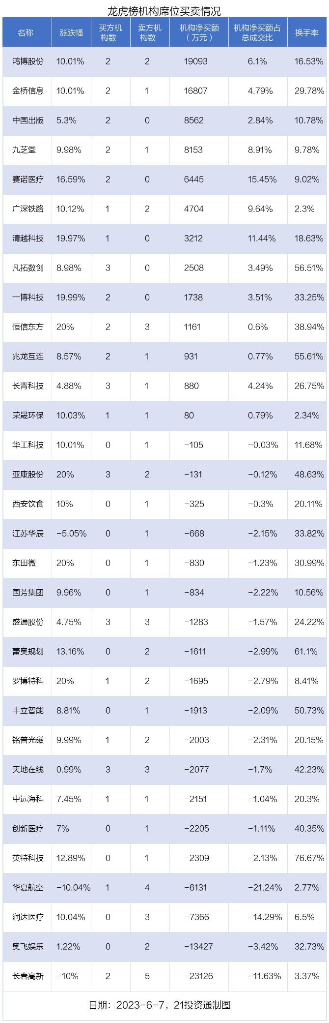 6月7日,32只个股龙虎榜出现了机构的身影,机构合计净买入4084.45万元。具体来看,机构净买入13股,净卖出19股。