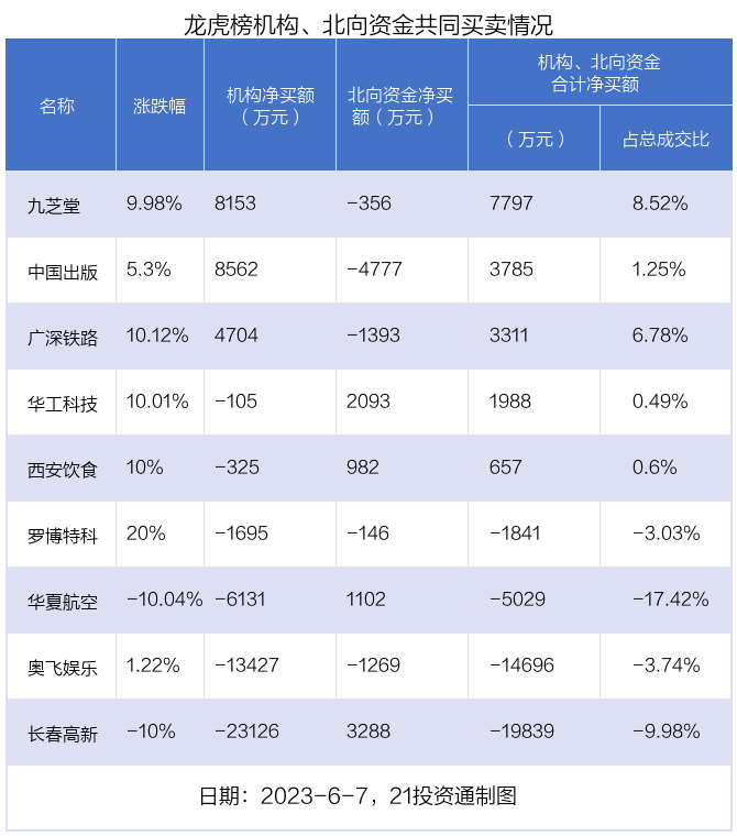 值得注意的是,机构和北向资金共同净卖出了罗博特科、奥飞娱乐等2股;在长春高新,华工科技,华夏航空,西安饮食,九芝堂,广深铁路,中国出版上出现分歧,机构净卖出长春高新2.31亿元,北向资金净买入3287.56万元;机构净卖出华工科技104.83万元,北向资金净买入2093.16万元;机构净卖出华夏航空6130.51万元,北向资金净买入1101.68万元;机构净卖出西安饮食324.67万元,北向资金净买入981.71万元;机构净买入九芝堂8152.69万元,北向资金净卖出355.99万元;机构净买入广深铁路4704.21万元,北向资金净卖出1393.37万元;机构净买入中国出版8562.11万元,北向资金净卖出4777.08万元。