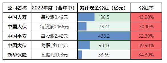 中国人寿2022年度现金分红也达到百亿级,分红率为43.2%;中国太保、新华保险、中国人保分红率分别为39.9%、34.3%、30.1%。