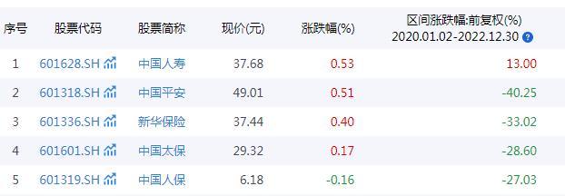 事实上,受行业转型和疫情等因素影响,近两年保险股整体表现均较低迷。同花顺iFinD数据显示,2020年至2022年三年来,仅中国人寿股价保持13%的增长,中国平安、新华保险、中国太保、中国人保跌幅均超20%。