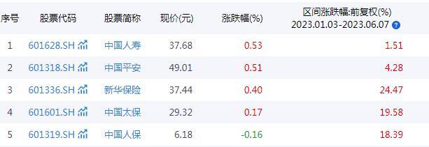 可喜的是,投资端改善,加上良好的经营数据作为支撑,A股保险板块今年以来表现强劲。2023年1月3日至6月7日,五大上市险企股价均有涨幅,新华保险、中国太保、中国人保涨幅均达到两位数,分别为24.47%、19.58%、18.39%。