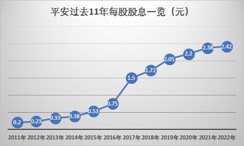 据统计,中国平安自A股上市(2007年)以来,已累计32次派现,连续11年提升现金分红,且连续6年每股分红在1元以上。2017年至2022年,每股现金分红分别为1.5元、1.72元、2.05元、2.2元、2.38元、2.42元。