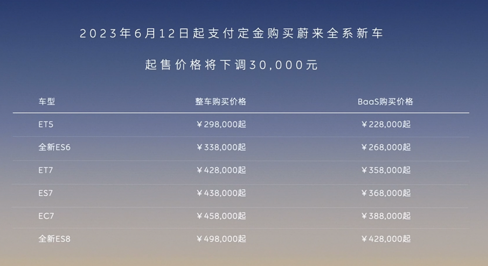 6月12日上午,蔚来宣布调整新车的价格,全系车型起售价降低3万元。新购车用户首任车主权益调整为:整车6年或15万公里质保,其中三电系统可享10年不限里程质保;6年免费车联网;终身免费道路救援。
