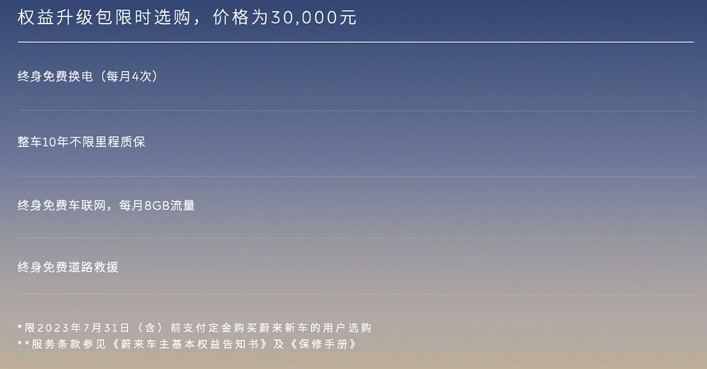 在6月12日到7月31日期间,用户可花3万元选购“权益升级包”,升级后的权益包括终身每月4次的免费换电,整车10年不限里程质保,终身免费车联网(每月8GB流量)以及终身免费道路救援。