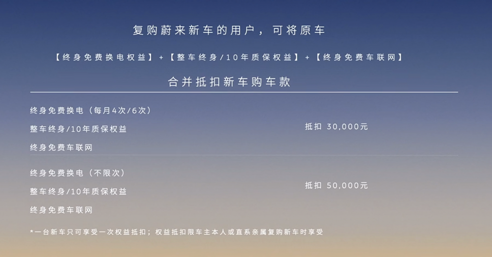 另外,复购蔚来新车的用户可将终身免费换电+整车终身/10年质保+终身免费车联网的权益合并抵扣新车购车款,根据换电次数不同分为3万元和5万元。