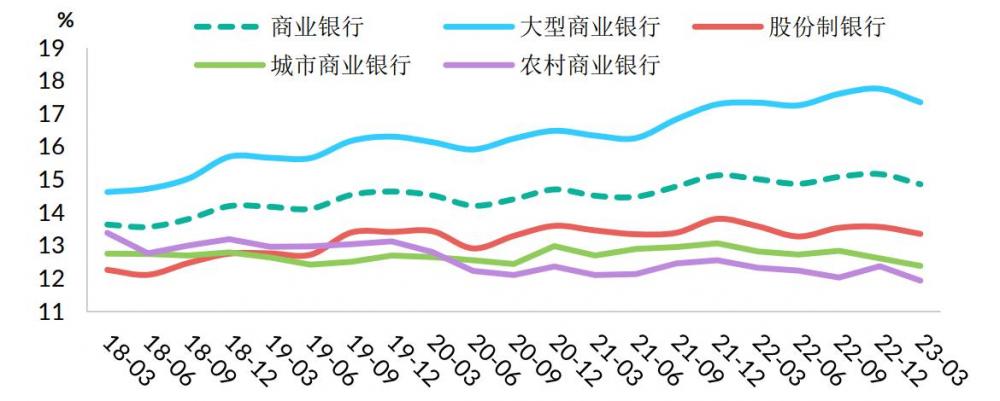 (2018年—2023年一季度各类商业银行资本充足情况,来源:惠誉博华)