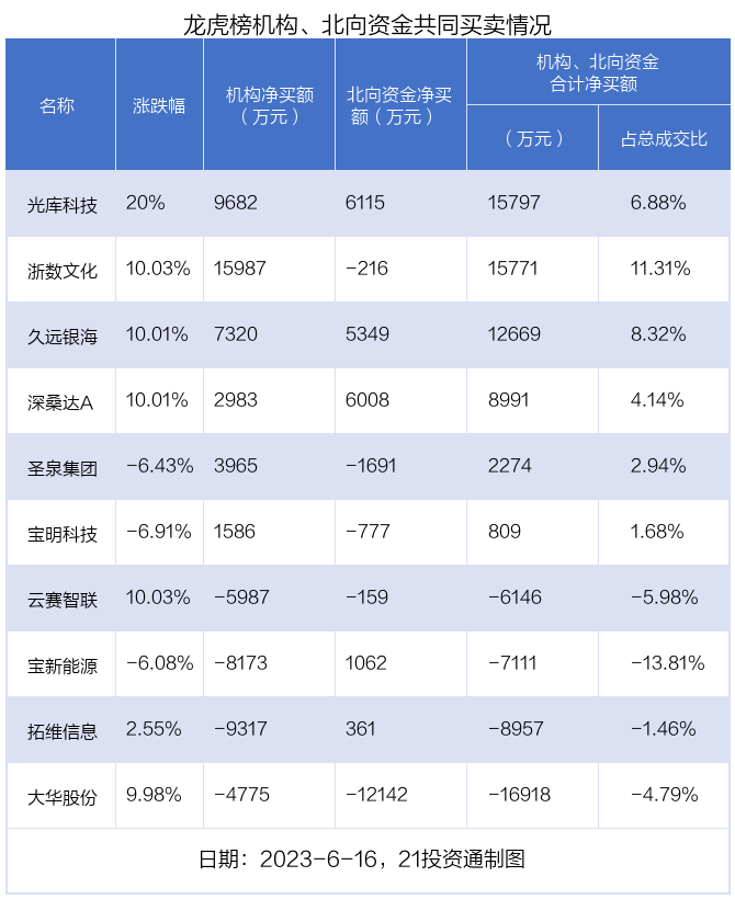 值得注意的是,机构和北向资金共同净买入了光库科技、深桑达A、久远银海等3股;共同净卖出了云赛智联、大华股份等2股;在宝新能源,拓维信息,浙数文化,宝明科技,圣泉集团上出现分歧,机构净卖出宝新能源8173.5万元,北向资金净买入1062.16万元;机构净卖出拓维信息9317.43万元,北向资金净买入360.8万元;机构净买入浙数文化1.6亿元,北向资金净卖出215.88万元;机构净买入宝明科技1585.53万元,北向资金净卖出776.89万元;机构净买入圣泉集团3964.89万元,北向资金净卖出1690.62万元。