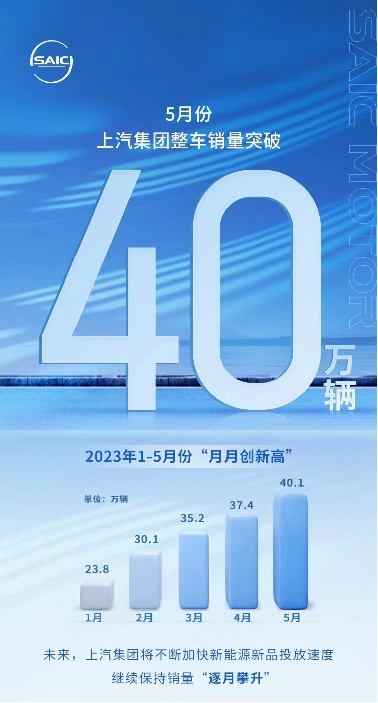 6月8日,上汽集团发布的产销快报显示,5月上汽销售整车40万辆,延续1月份以来“逐月环比连涨”的势头,并实现单月销量同比增长10.2%。上汽方面表示,未来将不断加快新能源新品投放速度,继续保持销量“逐月攀升”。