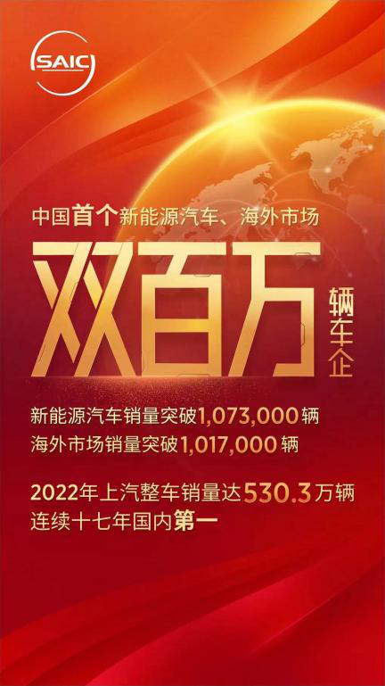 2022年,上汽集团销售整车530.3万辆,连续十七年保持国内第一,并率先成为中国首个新能源汽车、海外市场“双百万辆企业”。
