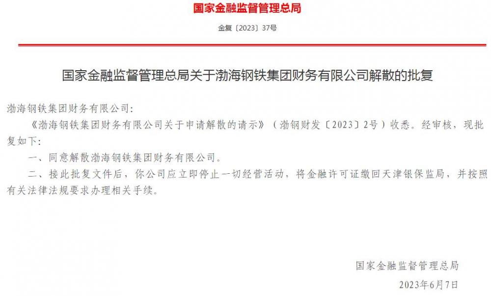 国家金融监督管理总局:同意解散渤海钢铁集团财务有限公司