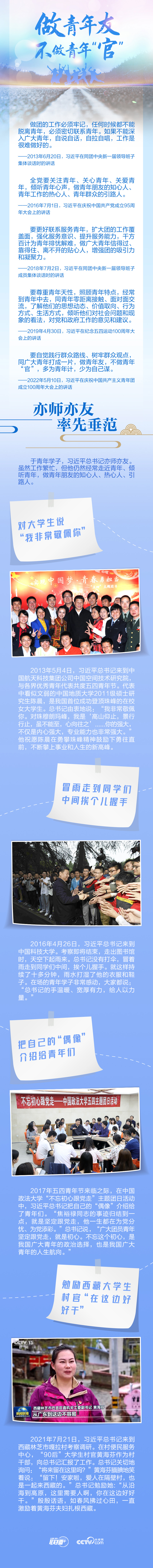 当代中国青年是与新时代同向同行、共同前进的一代。对于青年成长和青年工作,习近平总书记一直很关心。他曾明确指出,团干部要“做青年友,不做青年‘官’”。谆谆话语,发人深思。
