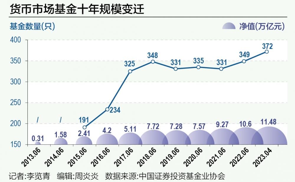 21世纪经济报道记者根据中国证券基金业协会数据统计,从2013年6月末-2022年6月末,中国货币基金净值从0.31万亿元飙升至10.6万亿元,据最新数据统计,截至2023年4月末,我国公募基金行业存续货币市场基金数量372只,基金份额114700.56亿份,基金净值114761.81亿元。