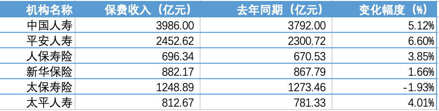 保费收入规模方面,中国人寿共实现保费收入3986亿元,同比增长5.12%;平安人寿共揽保费收入2452.62亿元,同比增长6.6%;太保寿险共实现保费收入1248.89亿元,同比减少1.93%;新华保险收入882.17亿元,同比增长1.66%;人保寿险收入696.34亿元,同比增速达3.85%。