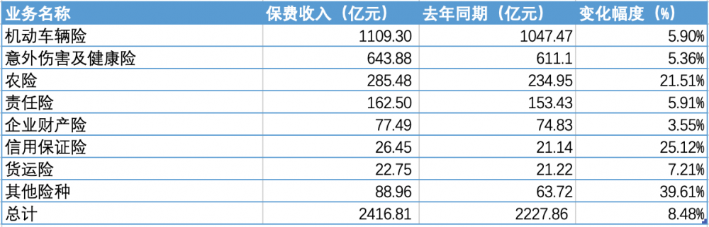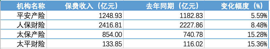 其中,人保财险保费收入2416.81亿元,同比增长8.48%;平安产险收入1248.93亿元,同比增长5.59%。剩余太保产险、太平产险2家公司保费规模虽不及人保财险、平安产险,但保费增速均达到15%以上,其中太保产险收入854亿元,同比增长15.28%,太平财险收入133.85亿元,同比增长15.36%。