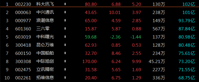 个股方面,科大讯飞成交额102亿元居首,中兴通讯成交额101亿元次之,浪潮信息、三六零、中科曙光等成交额居前。