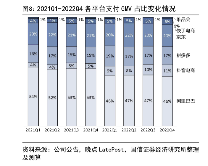 近几年,阿里巴巴电商业务市场份额的下滑速度惊人。早年,阿里曾占据着80%以上的电商市场份额,然而,据国信证券研报显示,2021年第一季度阿里巴巴的GMV占比仅有54%,到了2022年第四季度,这个数字降到了46%。
