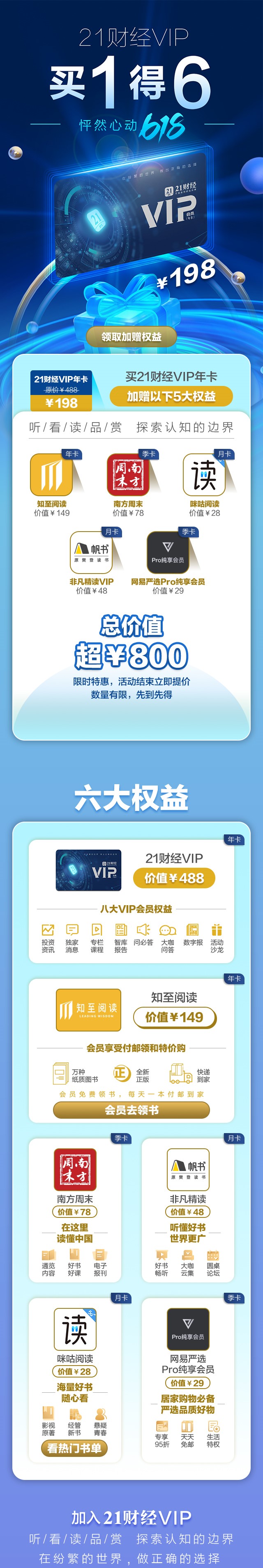 现在购买/续费21财经VIP年卡,你将免费获得五项加赠权益,包括知至阅读年卡、帆书(原樊登读书)非凡精读月卡、南方周末季卡、咪咕阅读月卡、网易严选季卡。全年超低价,一次性满足用户的“听/看/读/品/赏”全方位需求,与您一起探索认知的边界。
