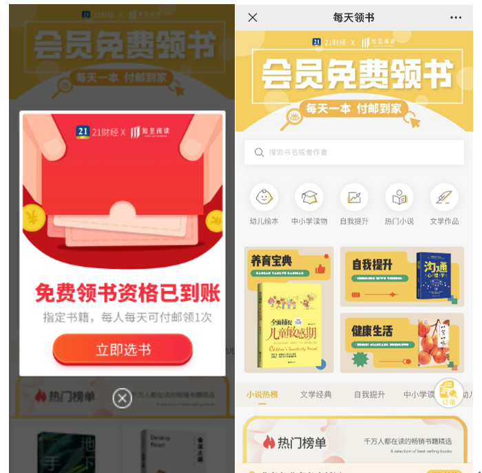 购买成功后登录21财经客户端进入活动页,下滑到知至阅读权益-点击【会员去领书】,即可体验会员权益。