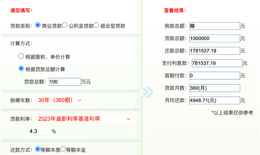 房贷利率若是4.3%,还款总额约178万元,每个月需还款4948.71元。