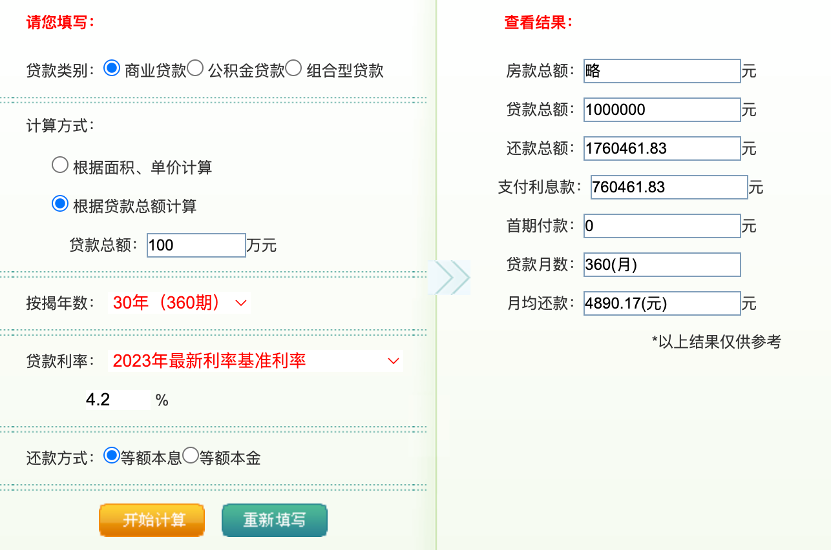 而房贷利率若是4.2%,还款总额则约为176万元,每个月需还款4890.17元。