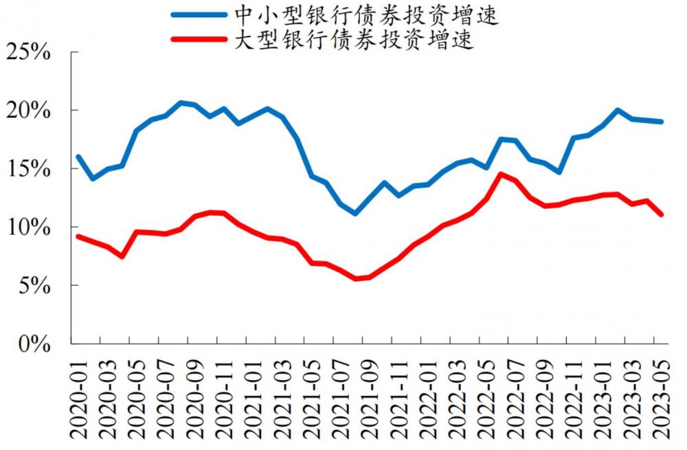 开源证券研究所数据分析显示,从2020年1月至2023年5月,中小银行债券投资增速远高于大型银行这一指标。