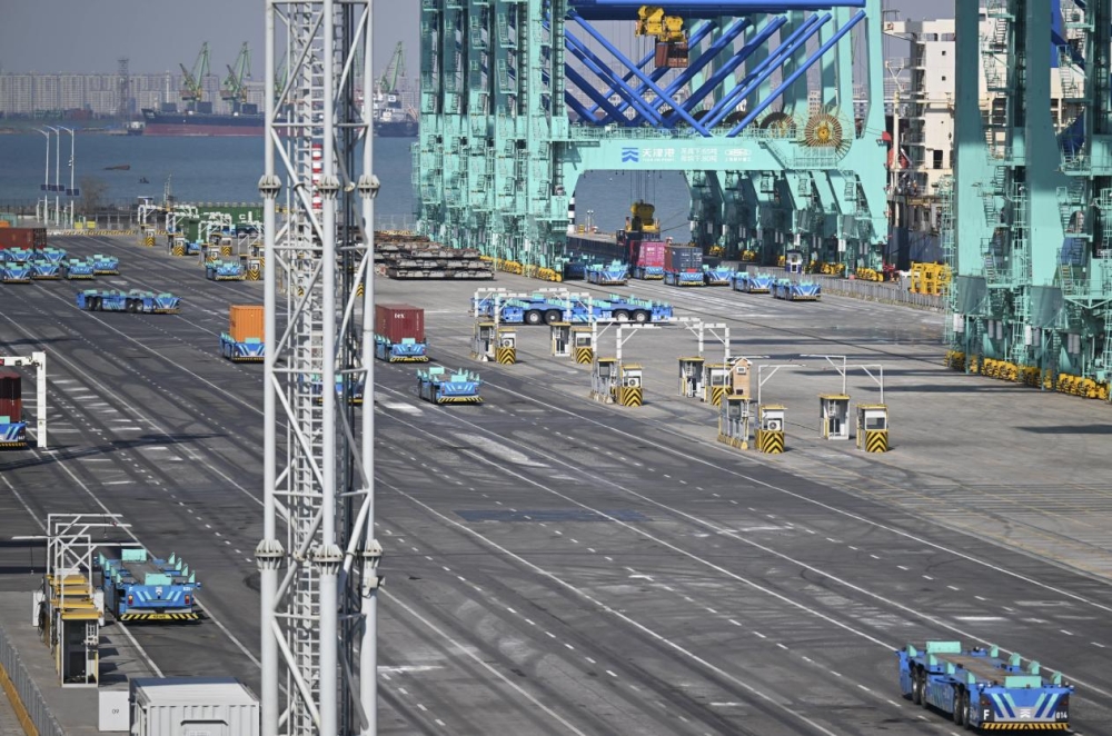 智能水平运输机器人在天津港全物联网集装箱码头作业(2月21日摄)。