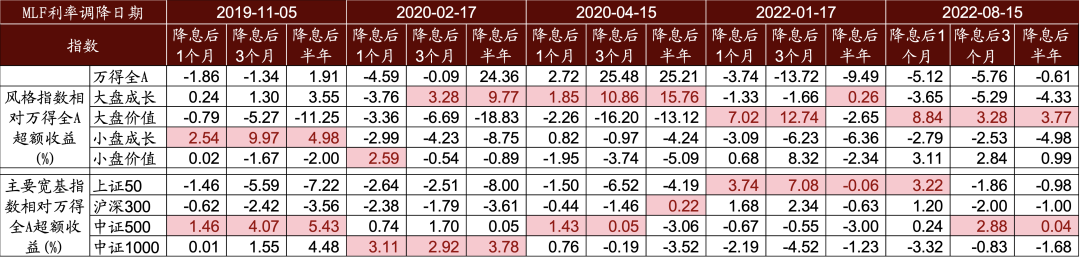 ▍表2:历次降息后A股主要宽基指数和风格表现