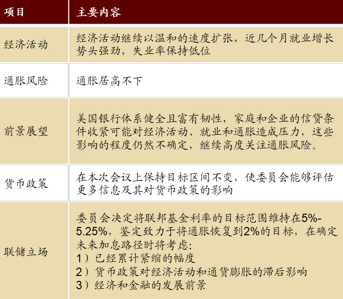 6月美联储议息会议维持联邦基金目标利率不变,这是美联储自去年3月份开启激进加息周期以来首次按下“暂停键”。本次声明中提到,本次会议保持利率目标区间不变,主要是为了委员会能够评估更多信息及其对货币政策的影响。