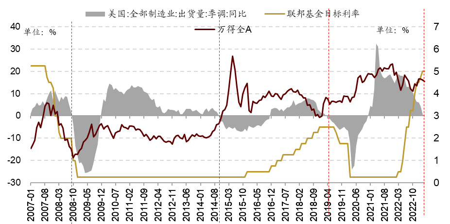 4月美国制造业出货额增速已经转负,显示美国经济下行压力确在增大,历史上该指标转负前后不久美联储或停止加息或开启降息,而A股在此后的一段时间表现都较好。这也进一步说明了,美联储货币政策的拐点已近在咫尺。