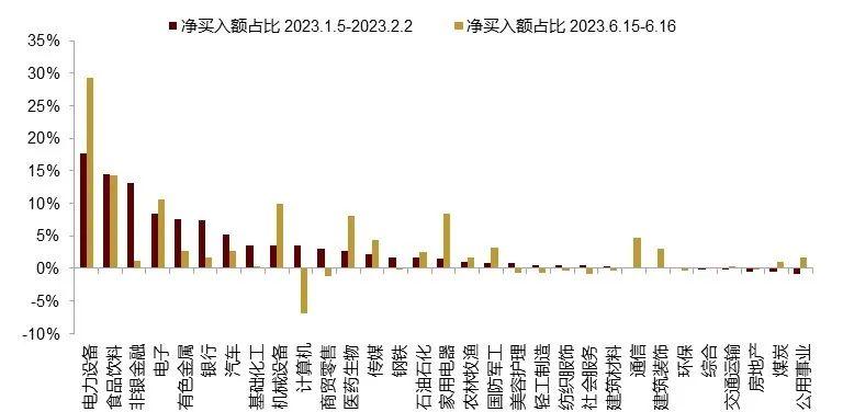 近期,北上资金净买入规模居前的行业中,除了年初以来大幅买入的“老三样”(电力设备、食品饮料、医药)外,还包括电子、汽车、家电等行业,其背后反映出两个主要的配置方向和逻辑: