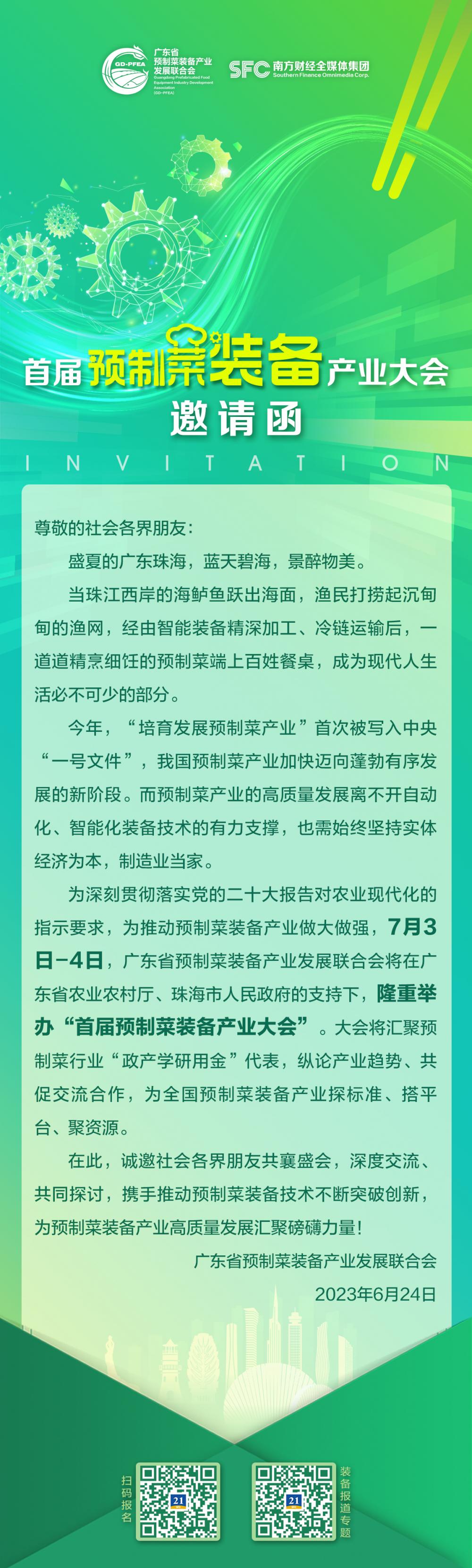 7月3-4日,由广东省农业农村厅、珠海市人民政府指导,广东省预制菜装备产业发展联合会主办,南方财经全媒体集团承办的“首届预制菜装备产业大会”将在广东珠海举办。广东省预制菜装备产业发展联合会向全球发出邀请信,诚邀各界一同参与,共襄盛举,聚力推动预制菜装备产业高质量发展。