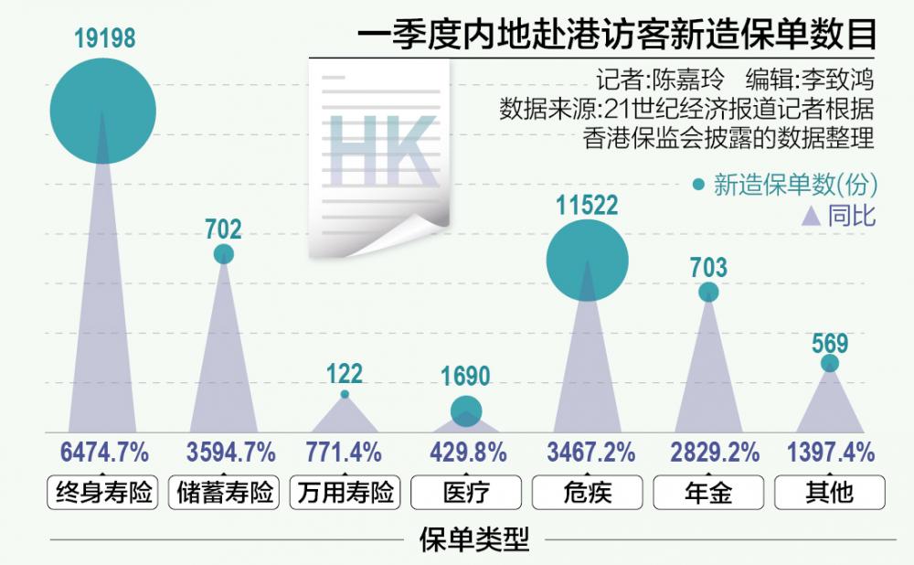 目前,香港保险市场的主流产品类型有重疾险、储蓄险、寿险、万能险、医疗险、投连险等。据香港保监局披露的数据,今年一季度,内地访客在香港地区购买的保单中,从保费增长情况看,按保单数计,终身寿险增长势头最猛,同比增长65倍;按保费计,年金、储蓄寿险增势亮眼,分别同比增长89倍、67倍。