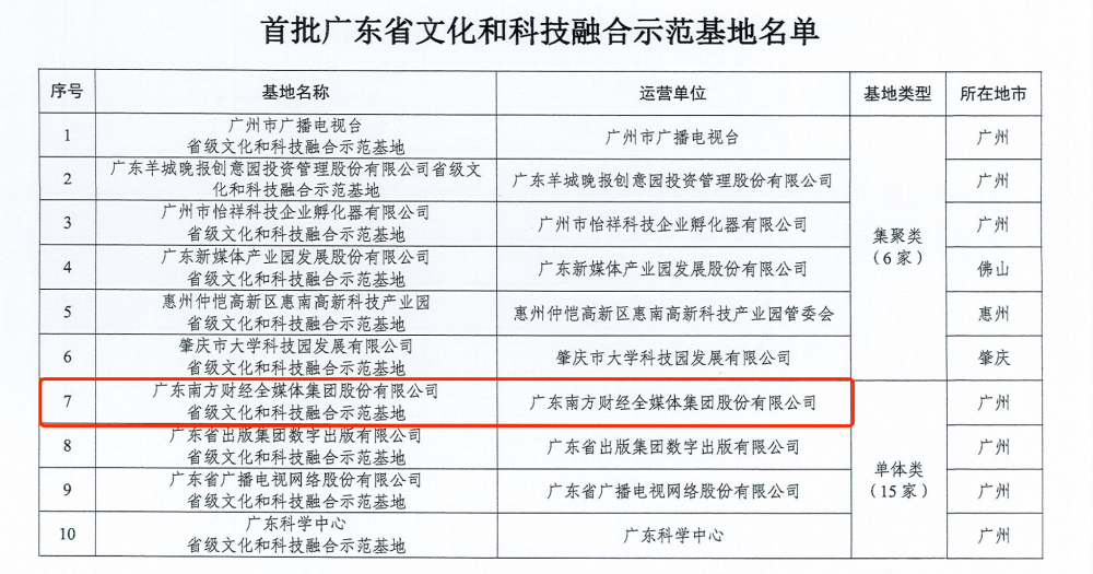 南方财经全媒体记者梁施婷 广州报道 6月28日,广东省科技厅、广东省委宣传部、广东省委网信办、广东省文旅厅、广东省广电局联合发布了首批21家广东省文化和科技融合示范基地名单。示范基地名单包括集聚类、单体类两大类型。其中,南方财经全媒体集团作为单体类基地入选。
