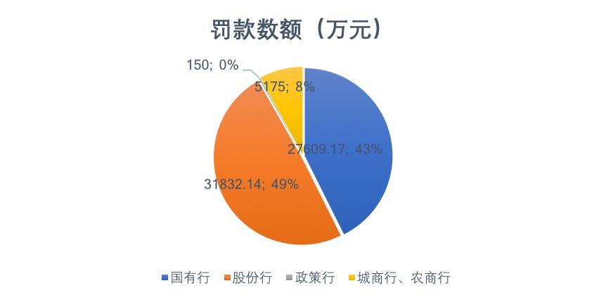 国有银行罚没金额总数位居第二,为27609.17万元,最大的一张罚单由总局机关开给建设银行,因“公司治理和内部控制制度与监管规定不符”“贷款审查严重不尽职、违规办理虚假按揭贷款”“违规收取民营企业、小微企业费用”等三十八项问题被没收违法所得并处罚款,总行和分支机构合计罚没19891.56万元,这也是近半年来银行罚单中数额最大的一笔。