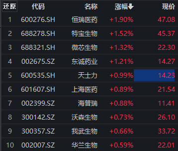 医药龙头恒瑞医药早盘走高,截至发稿,涨幅近2%。相关指数中,中证创新药产业指数(931152)早盘小幅拉升,成分股涨多跌少。截至发稿,成分股中,除恒瑞医药外,特宝生物、微芯生物、东诚药业涨幅超1%,天士力、上海医药、海普瑞、沃森生物、我武生物、华兰生物等跟涨。