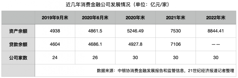 消费金融公司的资产和贷款规模变化情况,或可以部分解释上述被压降后的贷款流向。据监管数据显示,截至2019年末,24家消费金融公司贷款余额为4604亿元,直到2020年末贷款余额变化还不大,而在2021年出现了大幅增长,贷款余额增至7106亿元。