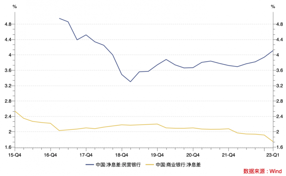 从净息差变化可以观察民营银行的客群变化,在商业银行整体净息差下行的背景下,2022年以来,民营银行净息差出现了逆势上行,2022年一季度至今年一季度分别为3.69%、3.77%、3.82%、3.94%、4.11%。
